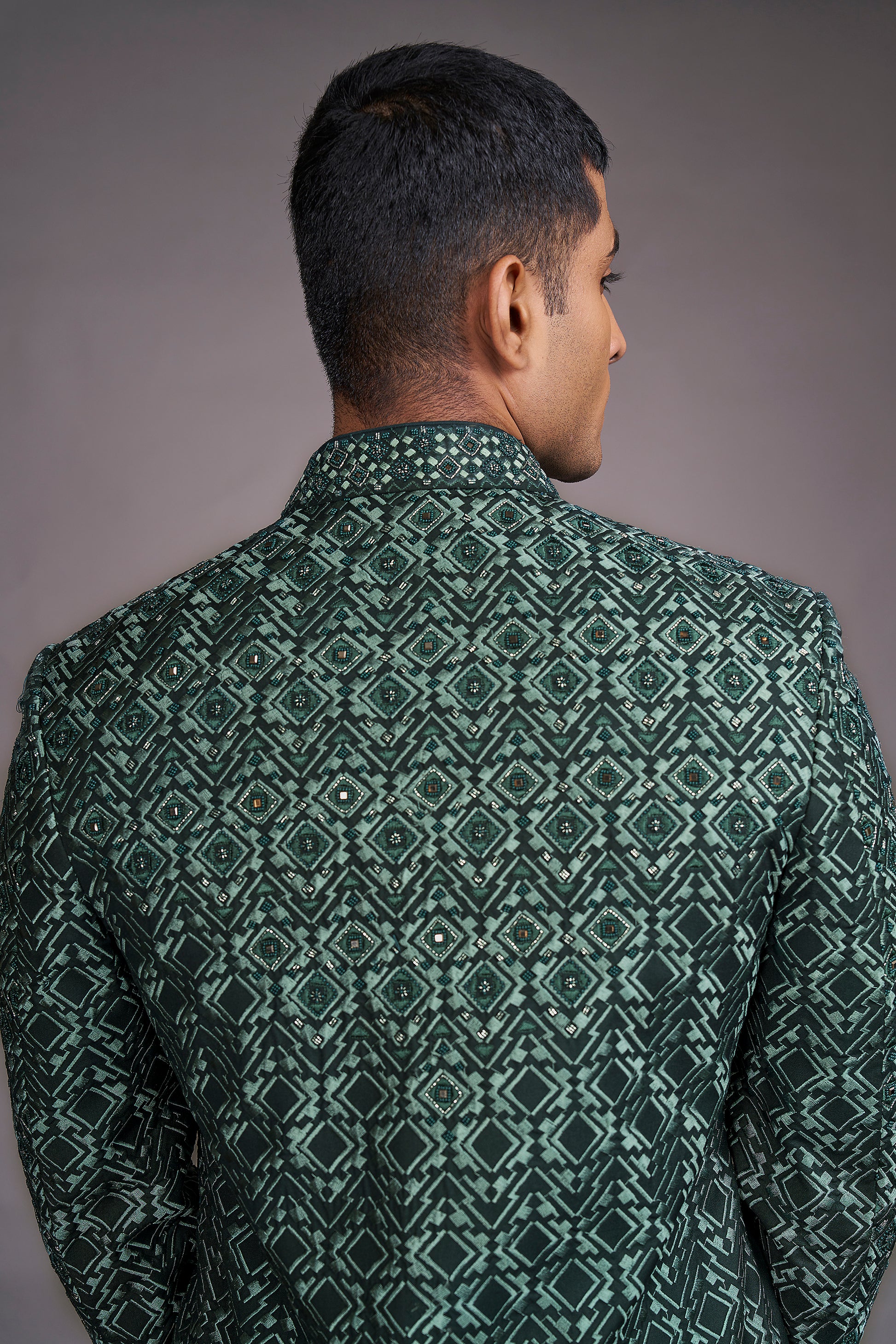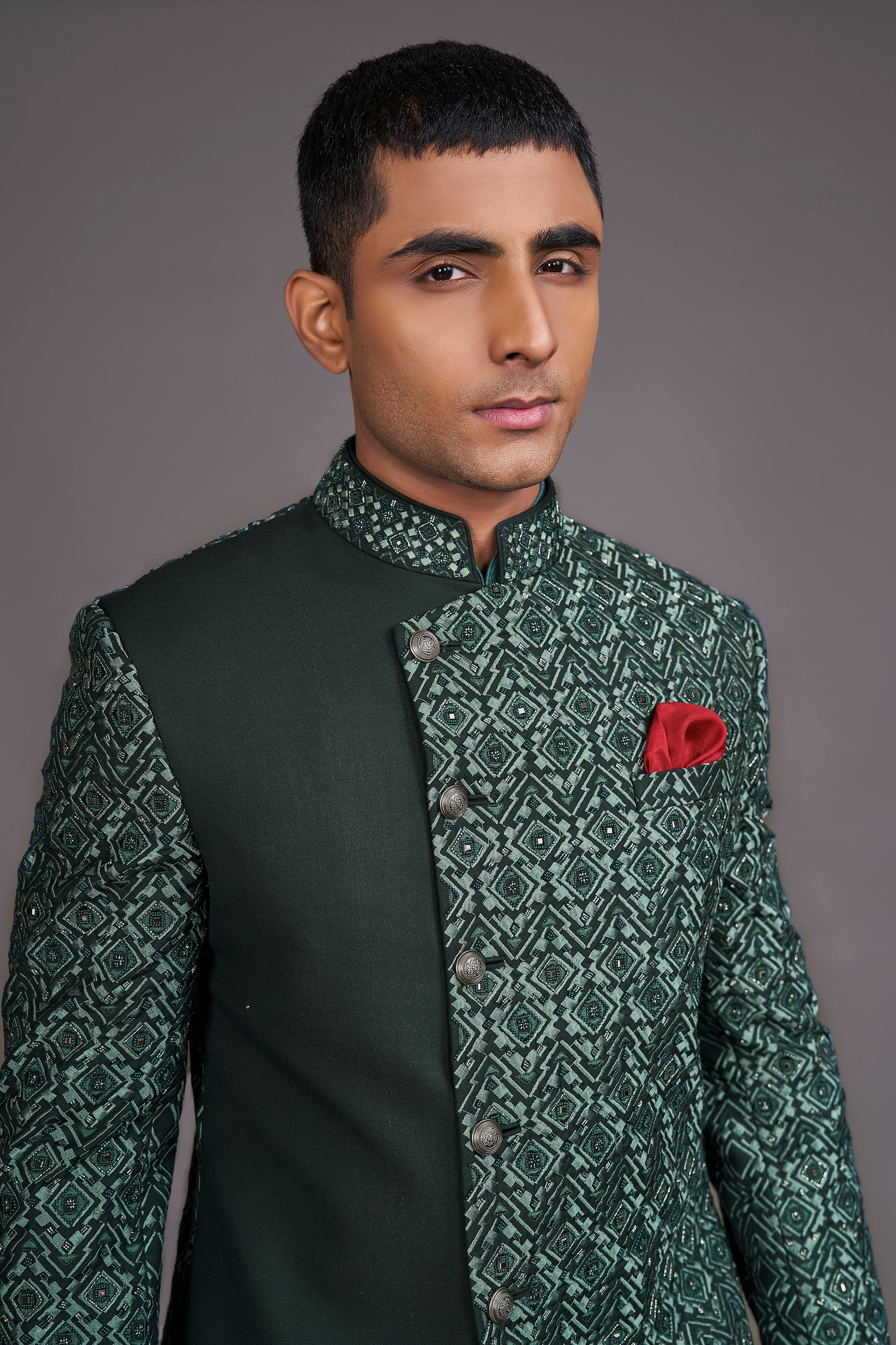 A striking bottle green Indo Western with an asymmetrical cut and draped kurta, adorned with one-sided embroidery for a contemporary ethnic appeal.