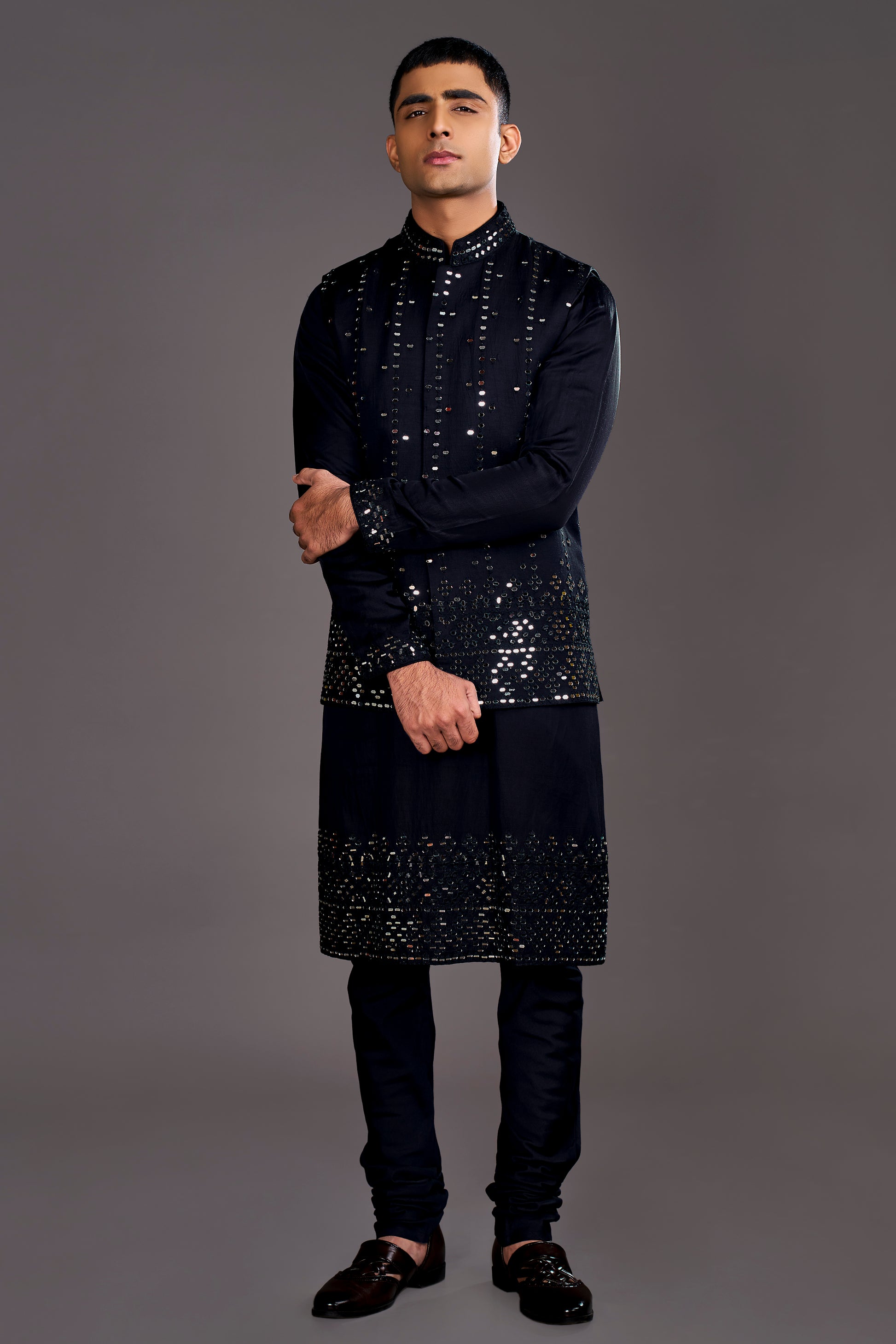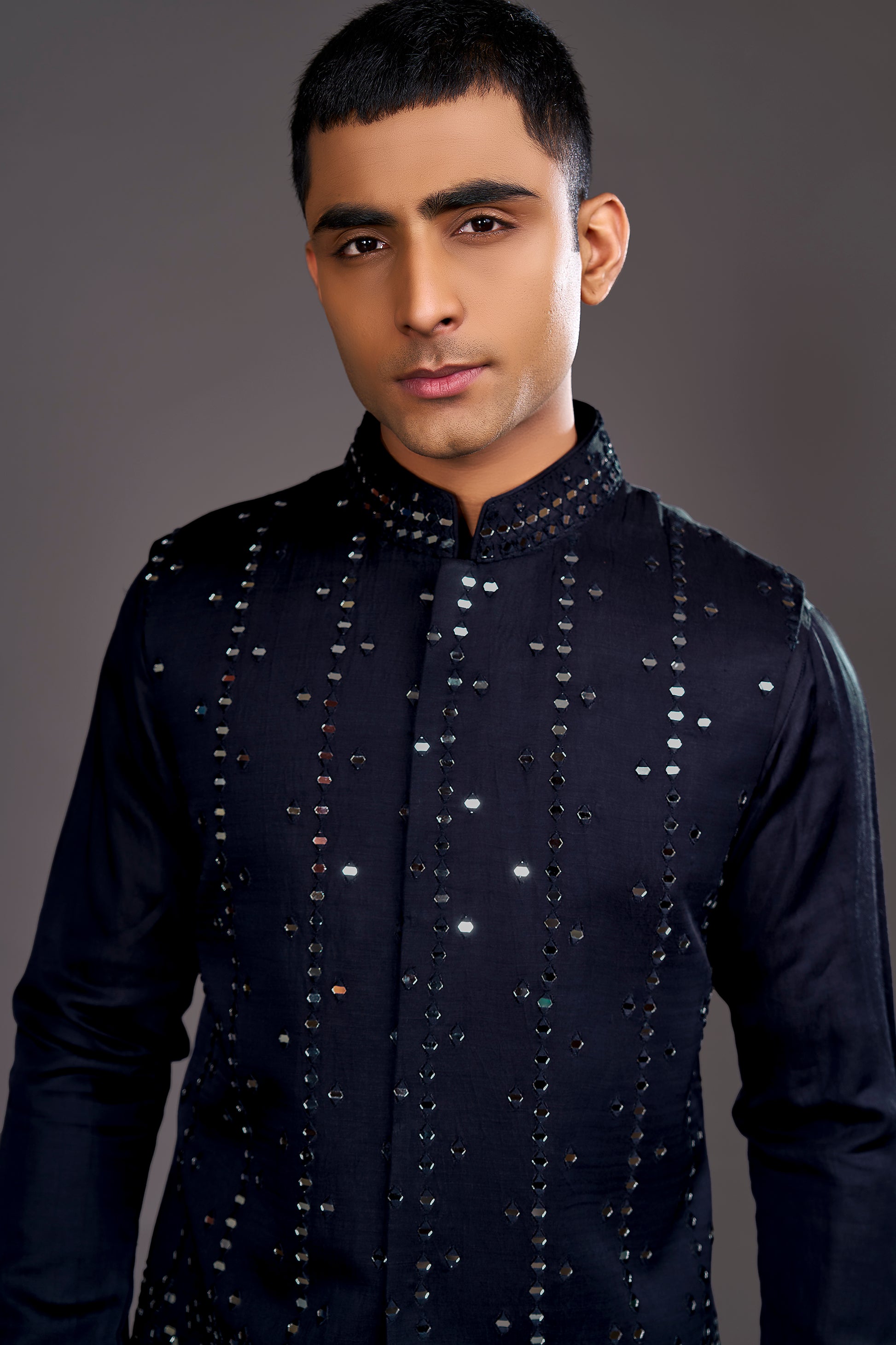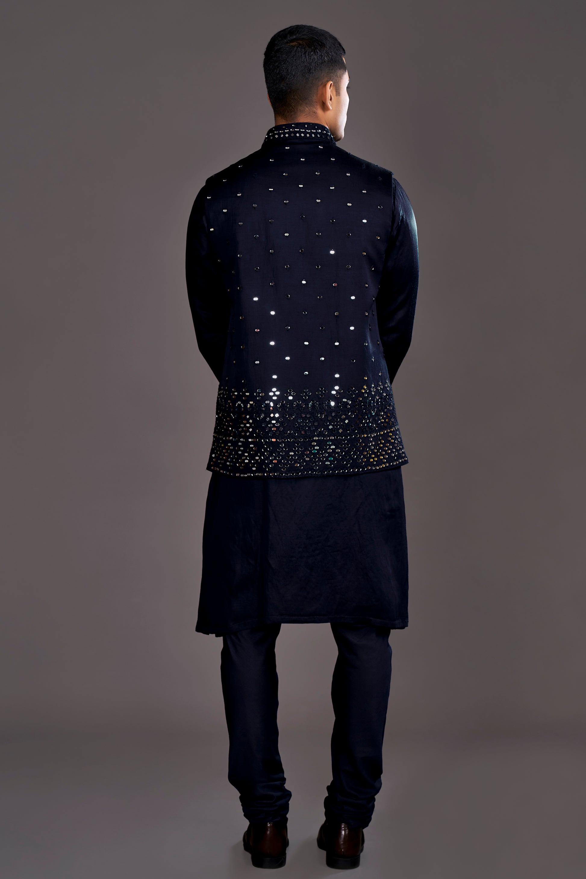 This navy blue bundi set is highlighted by intricate hand-embroidered mirror work, creating a dazzling and unique look. A standout piece for festive gatherings.