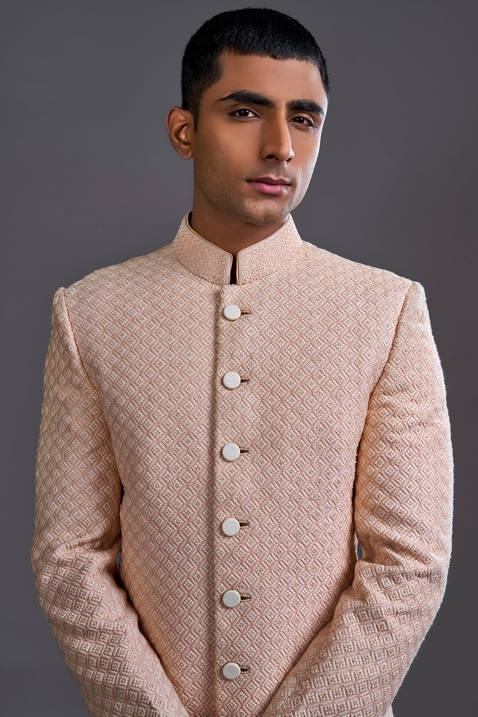 A chic peach Indo Western showcasing a geometric pattern with intricate pearl hand embroidery, ideal for adding a touch of sophistication to your wardrobe.