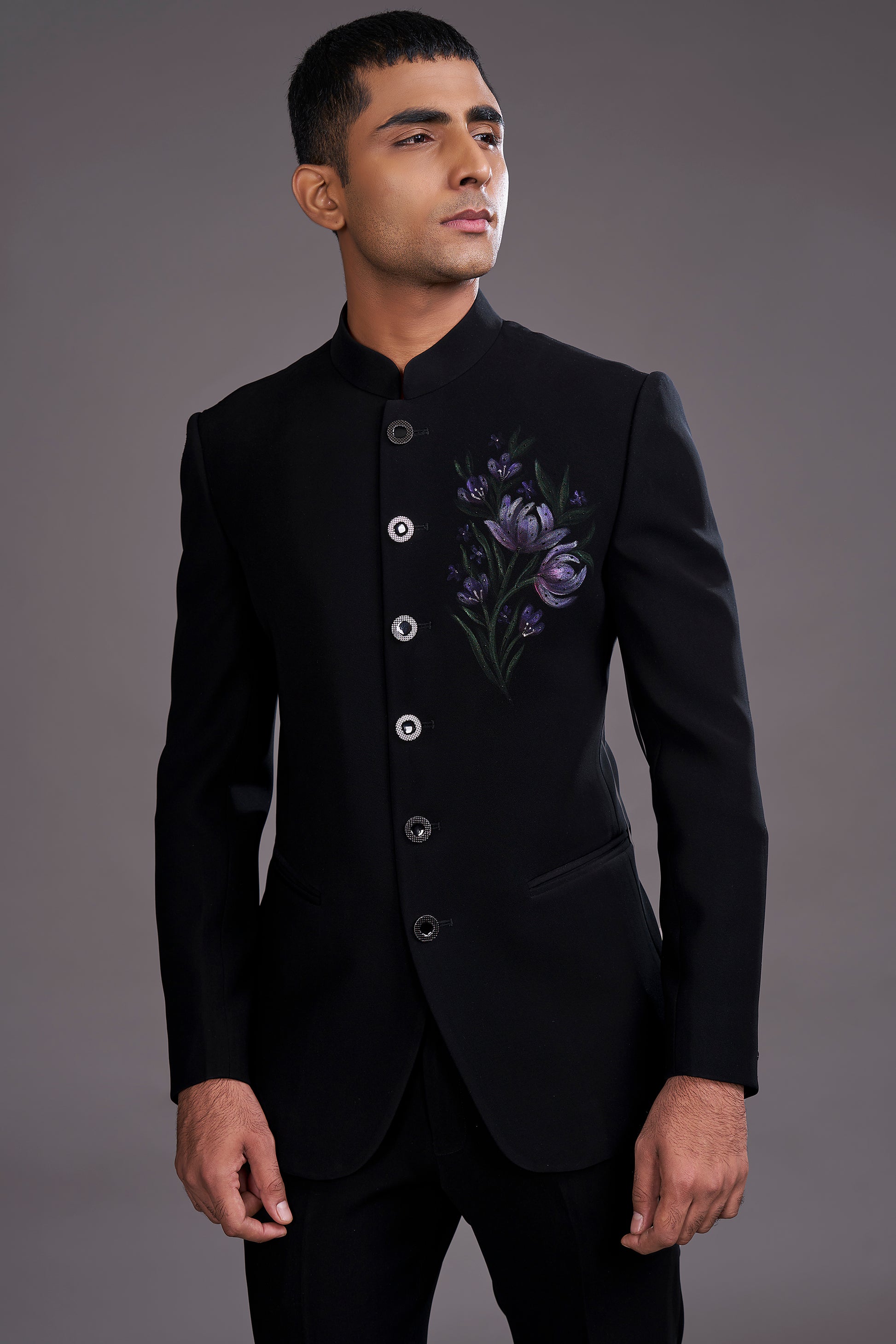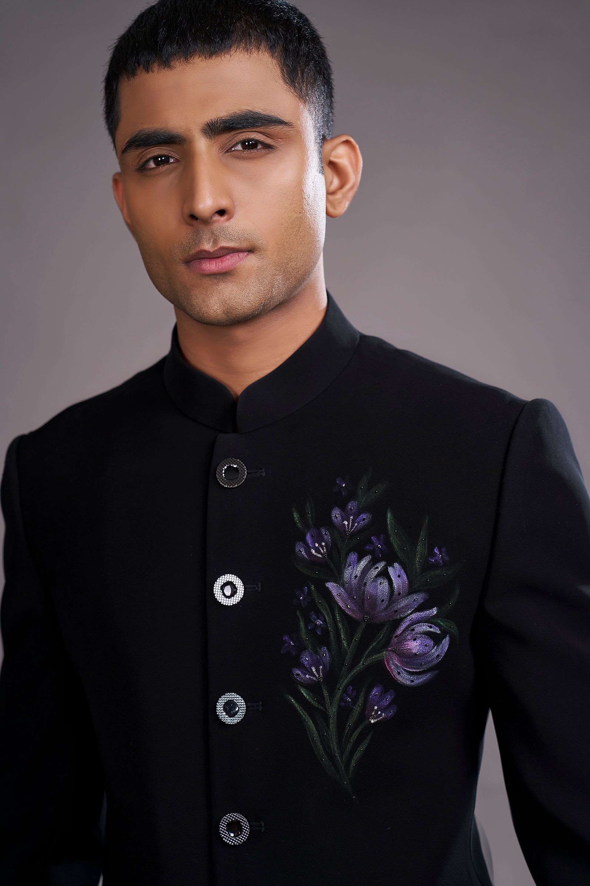 A garden blooms in night’s embrace, hand-painted florals soft and bright. On front and back, petals whisper with grace, a garment woven from nature’s light.