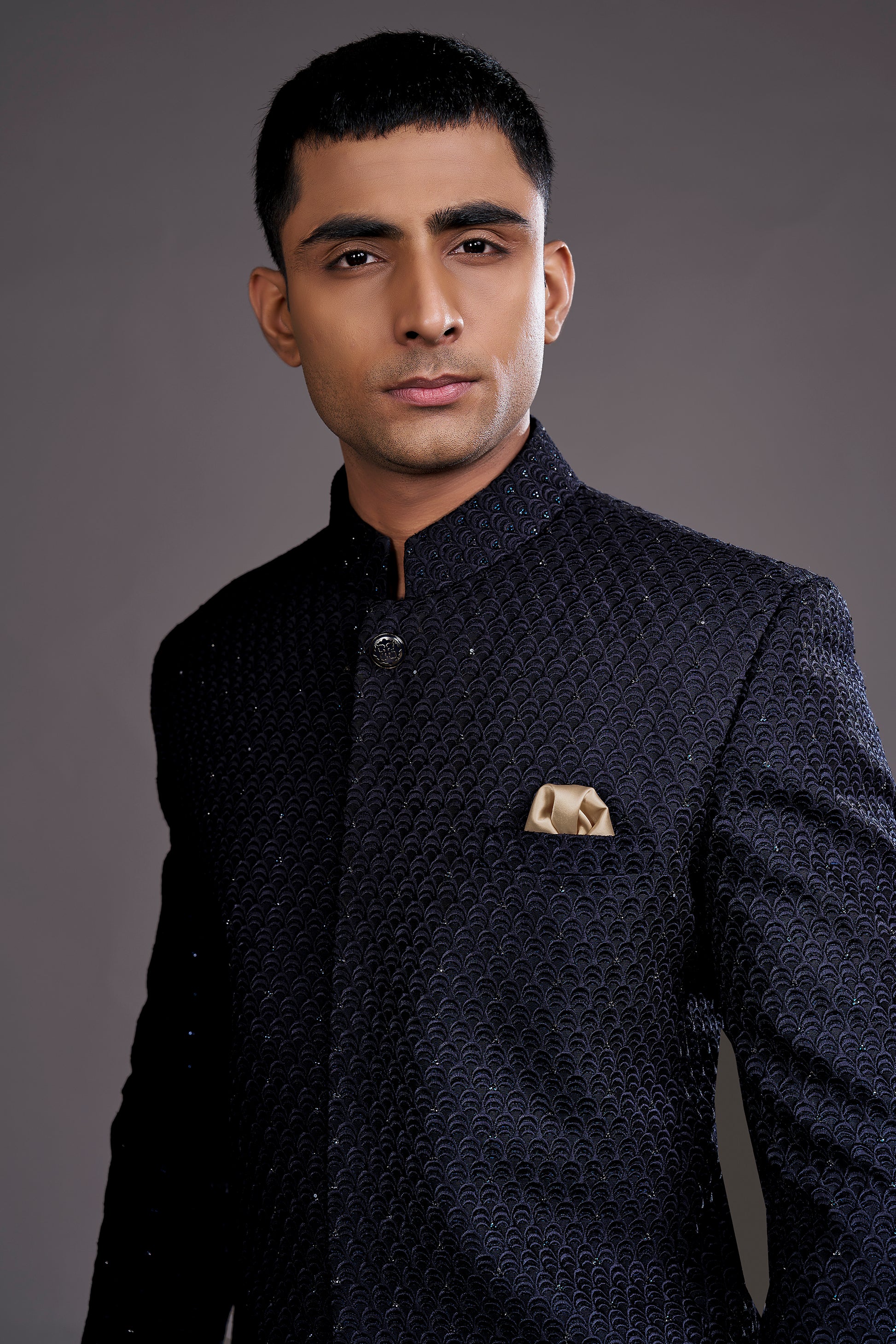 In deep blue seas of fabric, embroidery dances like stars at dusk. A touch of artful handwork transforms tradition into pure poetry.