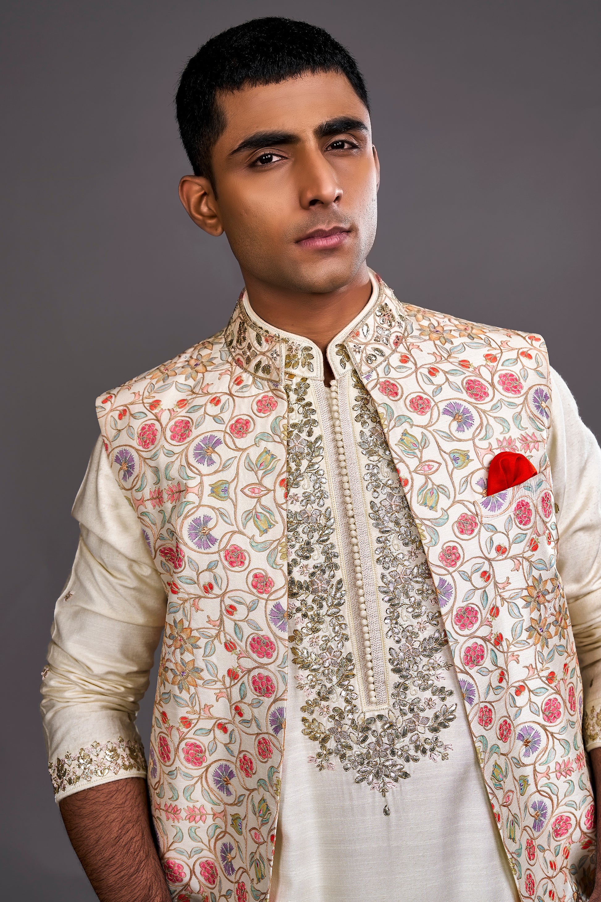 This vibrant multi-colored bundi set features a hand-embroidered kurta, adding a playful touch to your festive wardrobe. Ideal for making a bold statement.