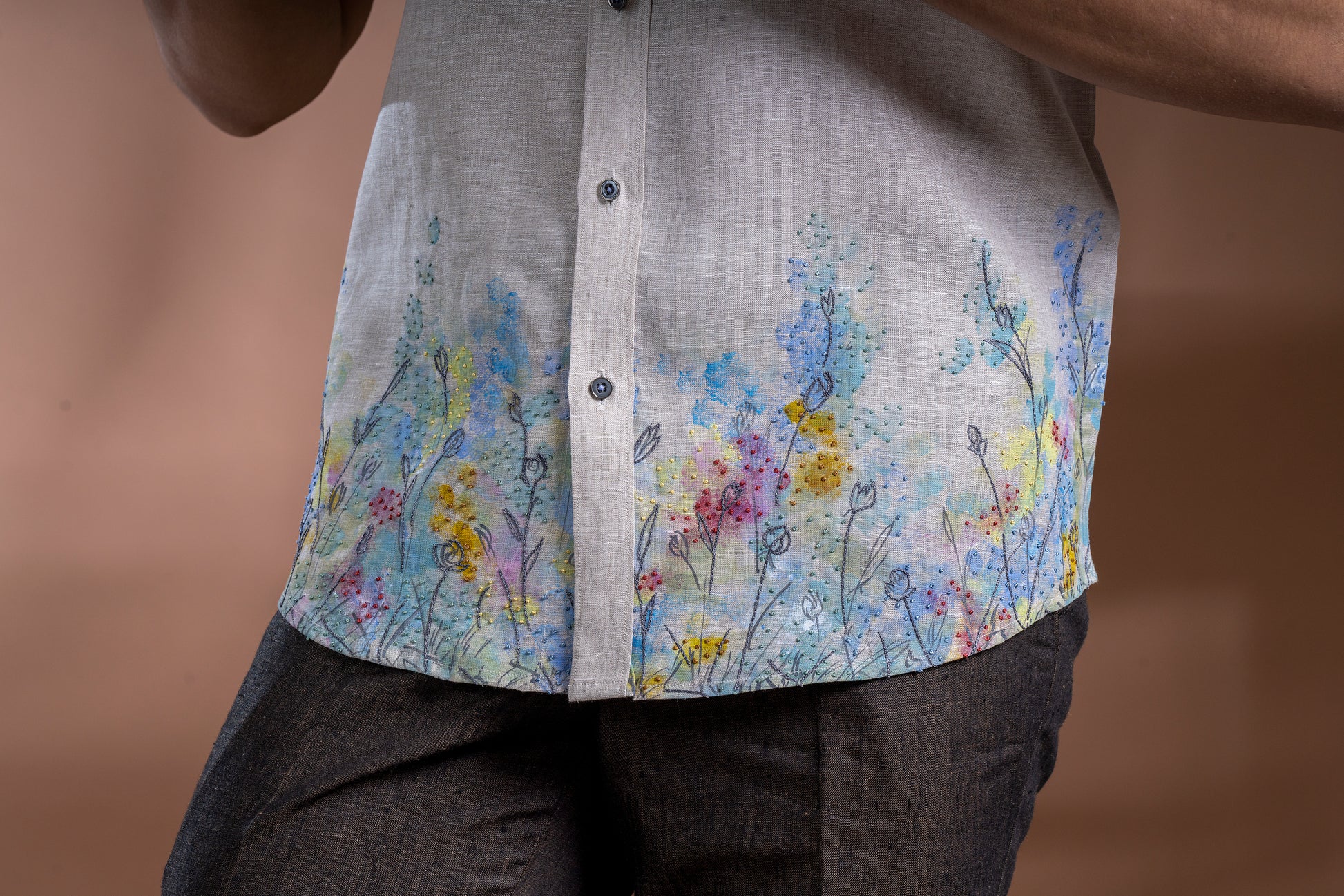 Linen Short Sleeve Shirt with Hand-Painted Colourful Field Motif.