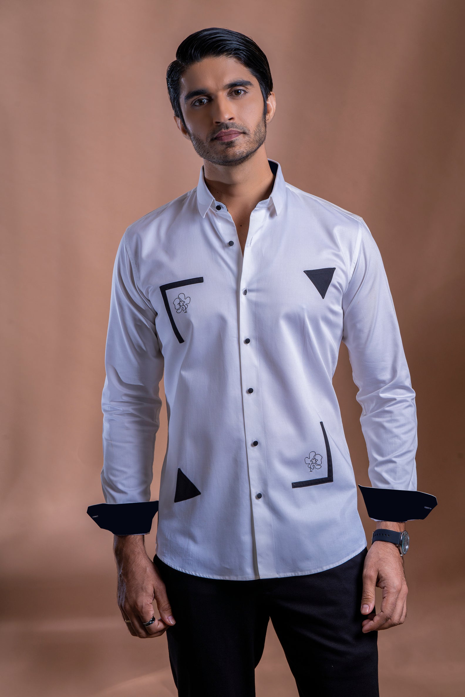 Pure White Cotton Shirt with Abstract Geometric Design – Features subtle artistry and a relaxed fit for modern, purposeful elegance.