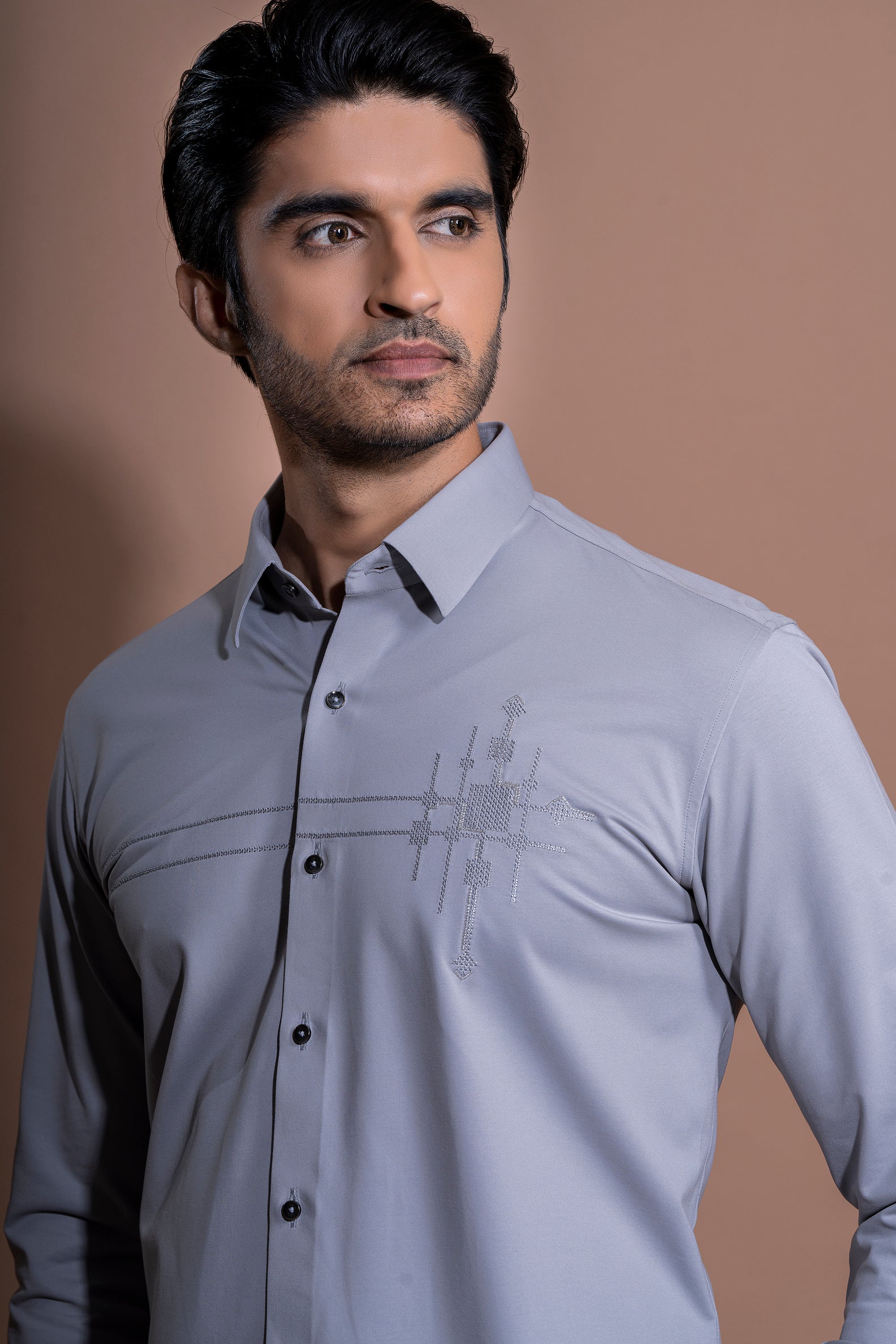 Self-Embroidered Silver Grey Knit Shirt – Crafted from premium knit material with subtle embroidery for all-day comfort and minimalist elegance.