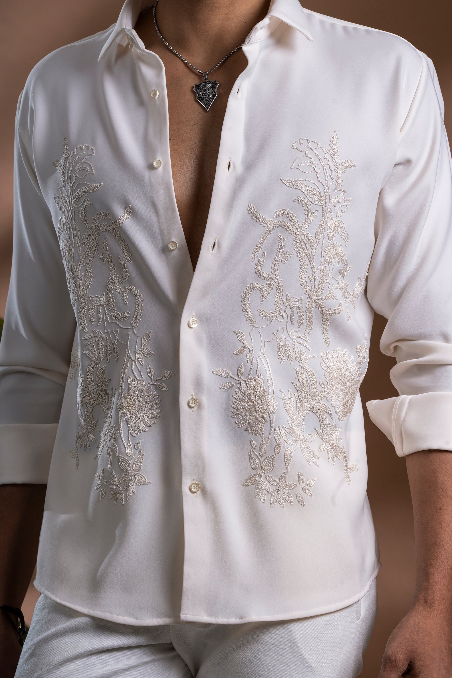 Cream Polyester Shirt with Handmade Floral Lace Motifs – Crafted for breathable comfort and refined detail in a tailored fit.