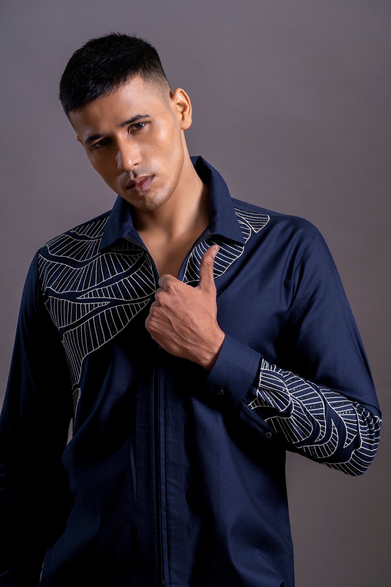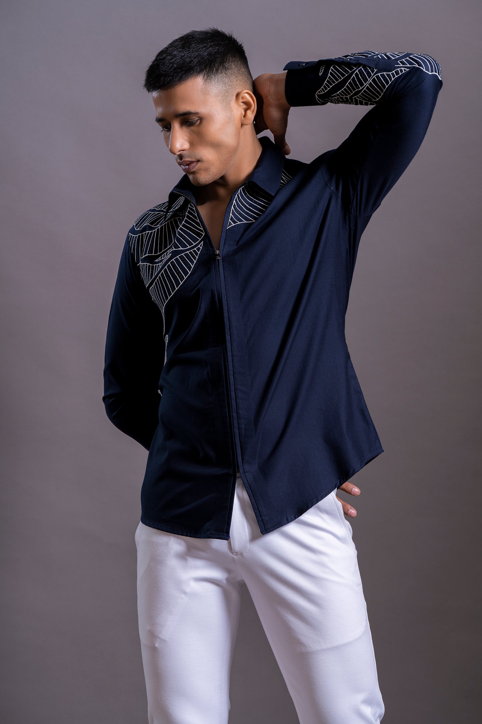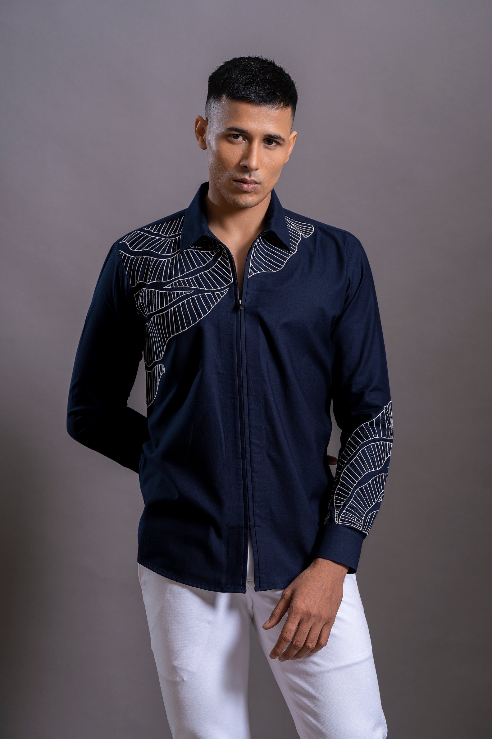 Hand-Embroidered Cotton Zipper Shirt – Features bold abstract motifs across chest and sleeve, crafted on breathable cotton for comfort with artistic flair.