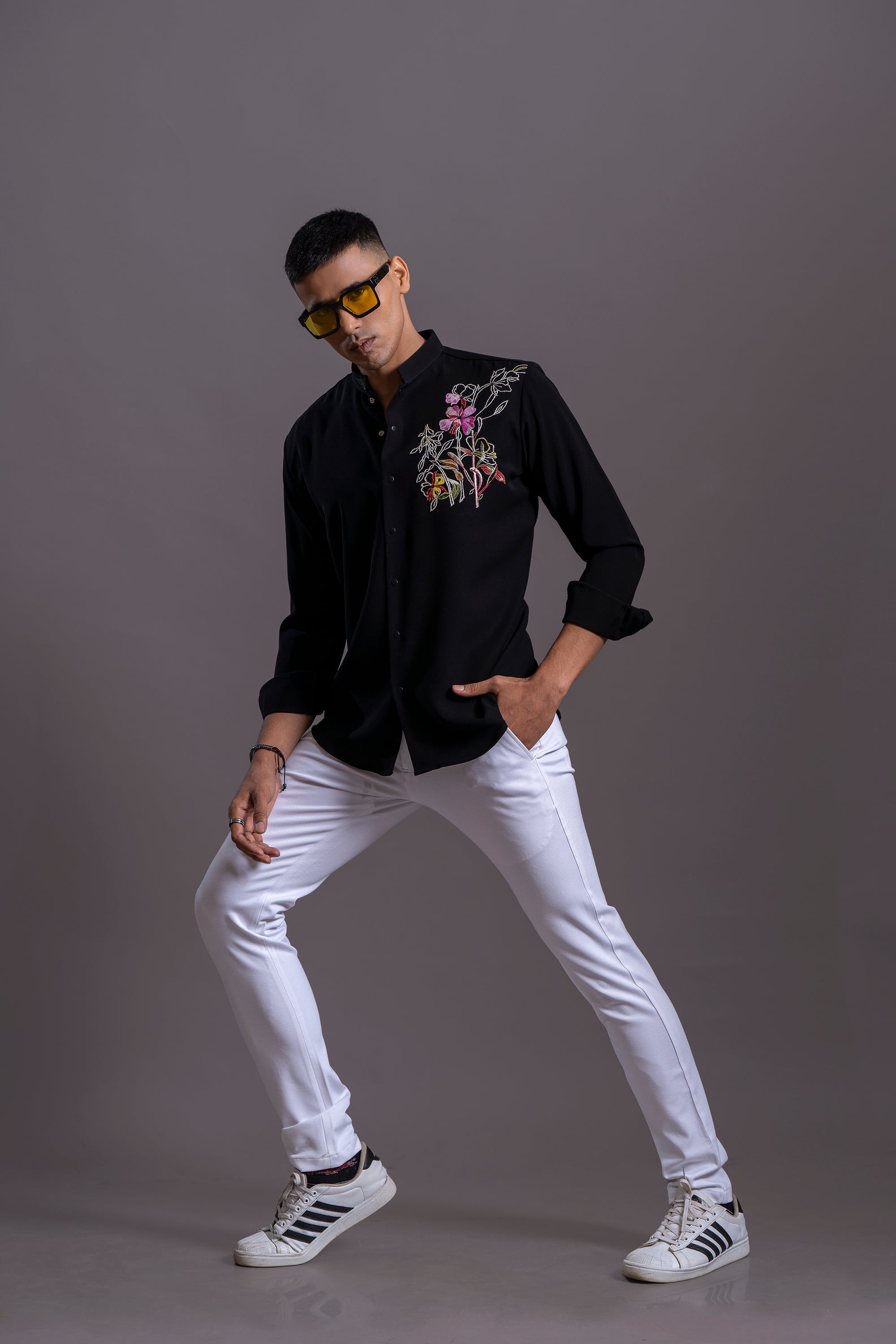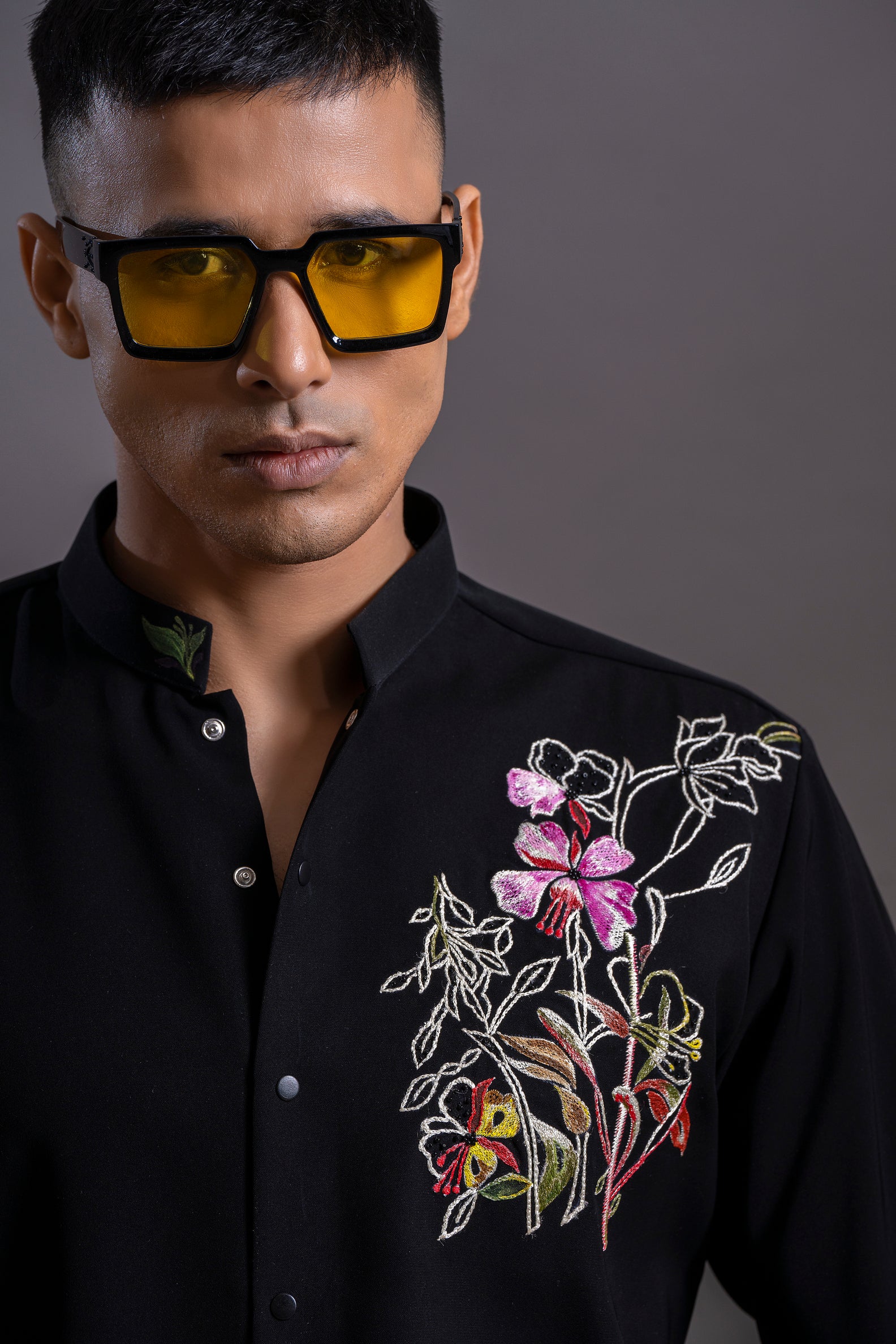 Hand-Painted and Hand-Embroidered Black Polyester Shirt – Features multicolored floral motifs crafted with rich detail on soft, breathable fabric and a smart mandarin collar.