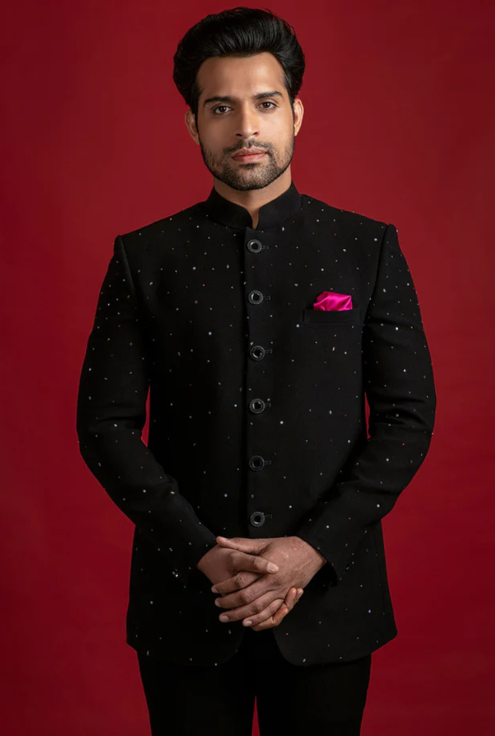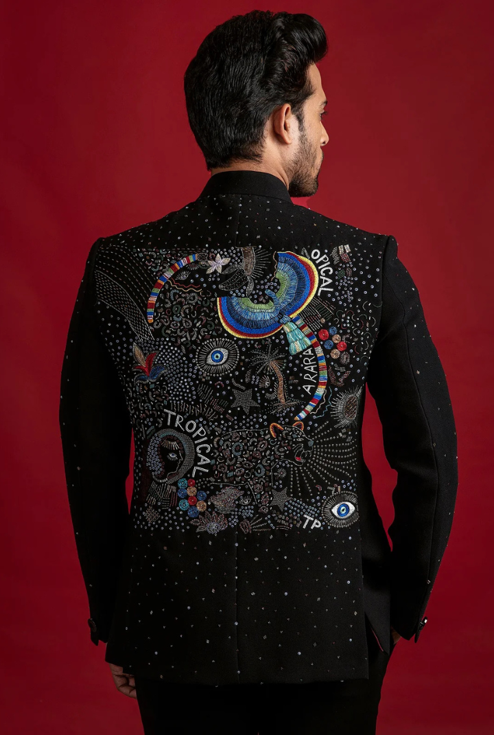 A black Jodhpuri suit adorned with multi-color embroidery all over and an intriguing embroidery on the back.